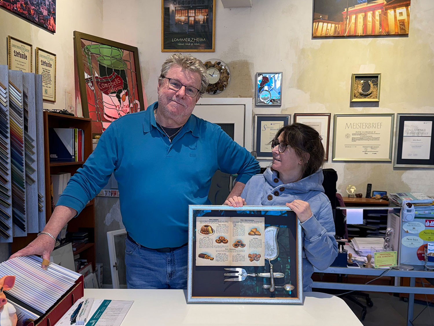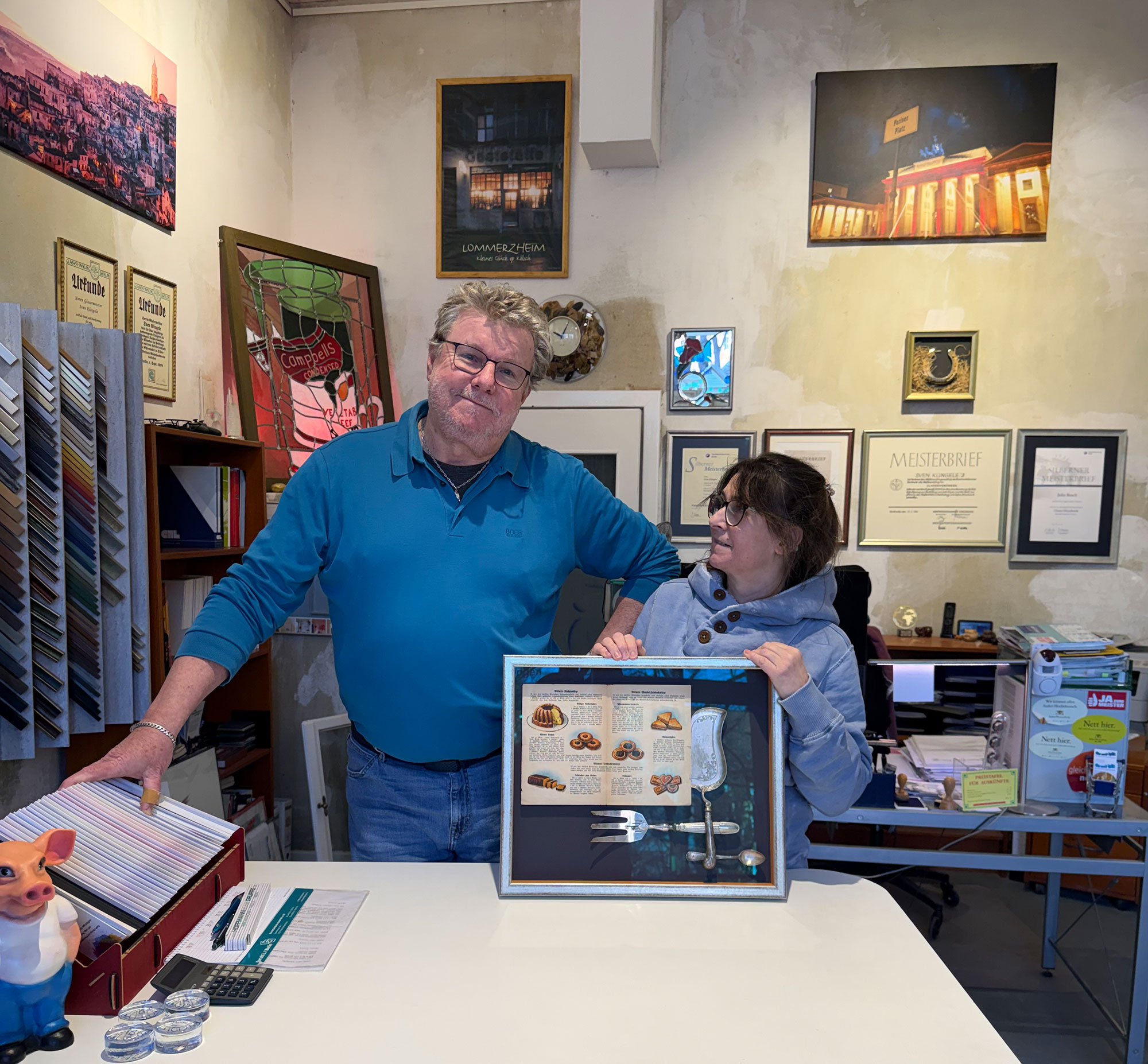 Besonderen Wert legen die beiden auf persönliche Beratung: Jedes Kunstwerk, jede Erinnerung, jeder Gegenstand wird individuell betrachtet und mit der passenden Rahmung versehen – sei es ein kostbares Original von Dali, ein altes Familienfoto oder ein durchgesägter Golfball. Ja, auch das hat es schon gegeben – in einer kunstvoll arrangierten Kastenrahmung mit Foto und passender Geschichte. Denn oft steckt hinter einem Objekt viel mehr als nur Material.